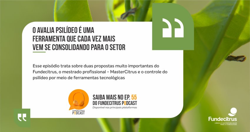 A edição 55 do Fundecitrus Podcast tratou sobre um estudo realizado no MasterCitrus – Programa de Mestrado Profissional em Fitossanidade dos Citros, que analisou a eficácia de inseticidas em populações de psilídeo provenientes de diferentes regiões do estado de São Paulo. O trabalho serviu como base para o desenvolvimento da plataforma Avalia Psilídeo, que contribui para o manejo do inseto nos pomares.